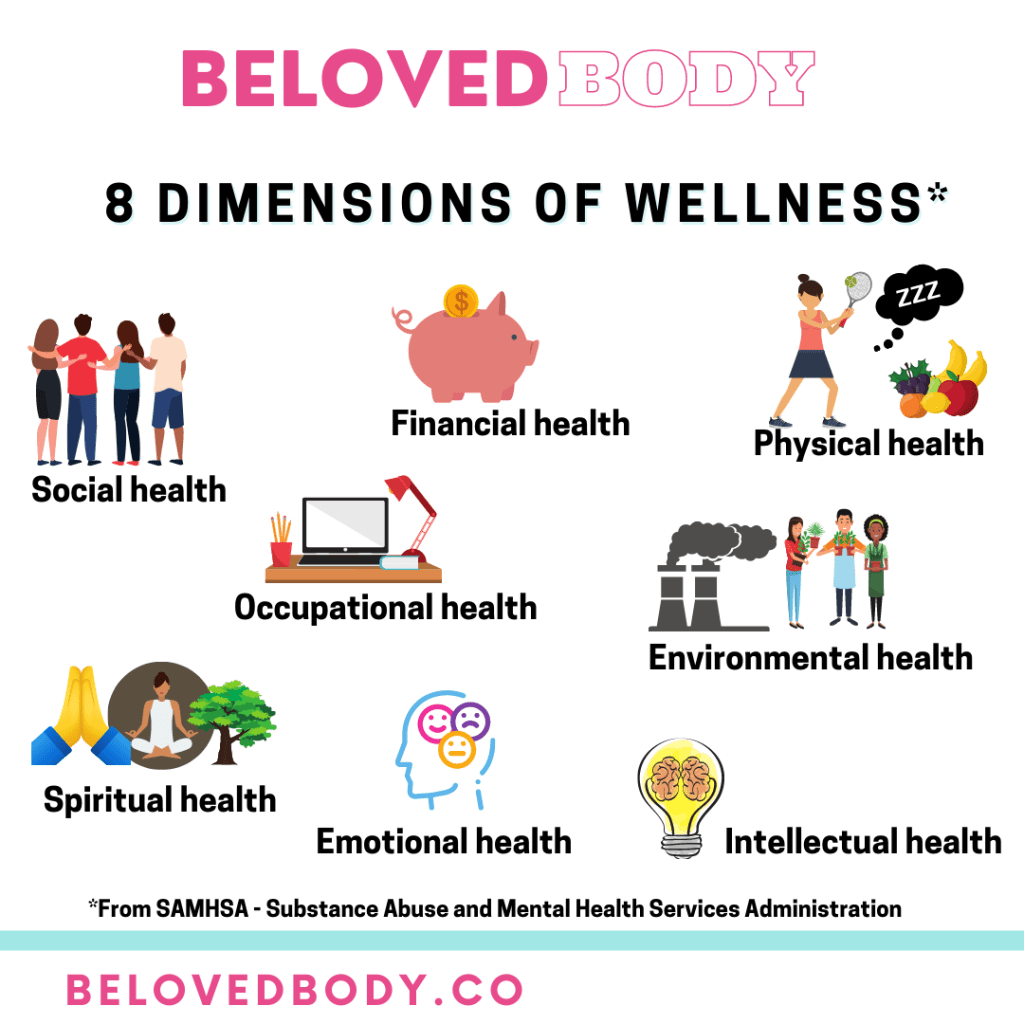 Her health > fitness point has become my mantra, but I’ve taken her concept a step further. Thanks to a health program led by my friend Alex, plus a youth mental health first aid training I did, I’ve learned that health is not just physical health. The Substance Abuse and Mental Health Services Administration outlines 8 dimensions of wellness (in no particular order): 1) social health 2). financial health 3). physical health 4). occupational (job/career) health 5). environmental health 6). emotional health 7). spiritual health 8). intellectual health.